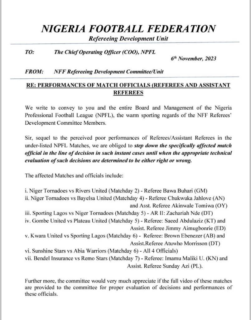 The committee says that as a result of perceived poor performances of Referees/Assistant Referees within the under-listed NPFL Matches, they’re obliged to step down the particularly affected match official within the line of resolution in such on the spot instances UNTIL when the suitable technical analysis of such selections are decided to be both proper or unsuitable.