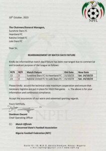 The match day three fixtures that had been rescheduled are Sunshine Stars versus Heartland and Katsina United versus Lobi Stars matches.