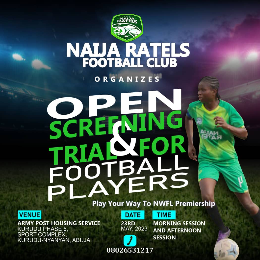 Nigeria Women Football League (NWFL) Premiership side, Naija Ratels is organising an open screening and trial for football players, beginning on Tuesday in Abuja.