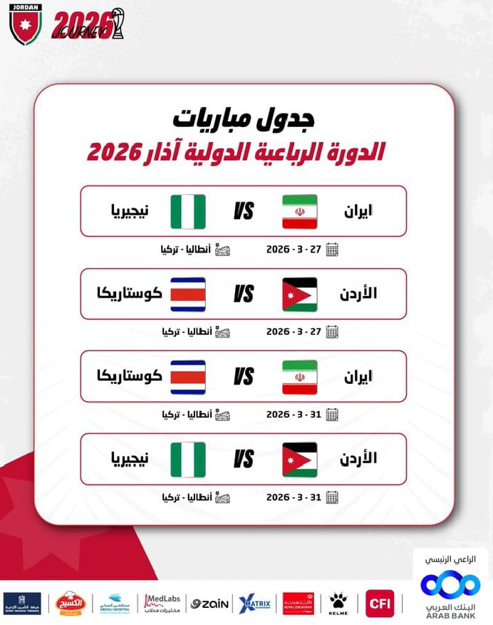 “The Jordanian Football Association has decided to move the matches of the four-team international friendly tournament, scheduled for March 2026, to be held in the Turkish city of Antalya, due to the current situation in the region and the limited movement of people,” the statement read.